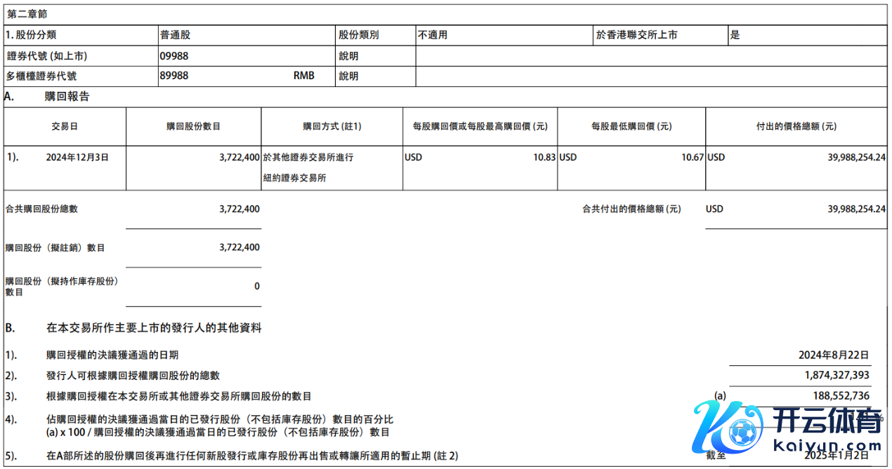 阿里巴巴:12月3日耗资约3998.83万好意思元回购372.24万股公司股份阿里巴巴:12月3日耗资约3998.83万好意思元回购372.24万股公司股份