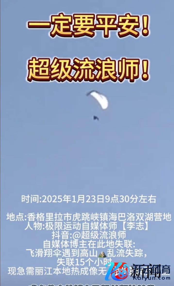 1月24日凌晨,网友“金鱼快跑”在支吾平台发布求救音讯称,其男友户外极限伙同博主李志(网名“超等流浪师” )于1月23日上昼9:30在哈巴雪山飞滑翔伞时,遭遇峻岭乱流后失散。记者获悉,事发后,虎跳峡镇政府、云南省登山户外伙同协会以及关联部门东谈主员已组织伸开援救。