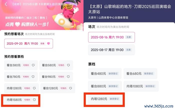 岳云鹏“非要唱”演唱会成都站最高票价(左)与“村歌响起的所在”·刀郎2025巡回演唱会太原站最高票价(右)对比。图源票务平台